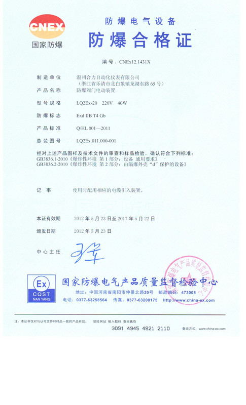 2012年5月4日,我公司向河南省國(guó)家防爆電氣產(chǎn)品質(zhì)量監(jiān)督檢驗(yàn)中心提交了我公司自主研發(fā)的LQ型防爆系列產(chǎn)品的相關(guān)技術(shù)資料。經(jīng)過檢驗(yàn)中心的嚴(yán)格檢驗(yàn),專家組一致認(rèn)為我公司產(chǎn)品技術(shù)先進(jìn),技術(shù)文件與防爆檢測(cè)中心的審查確認(rèn)一致,操作指導(dǎo)文件完整;5月22日,我公司系列產(chǎn)品成功通過防爆測(cè)試,并獲得國(guó)家防爆電氣產(chǎn)品質(zhì)量監(jiān)督檢驗(yàn)中心證書。